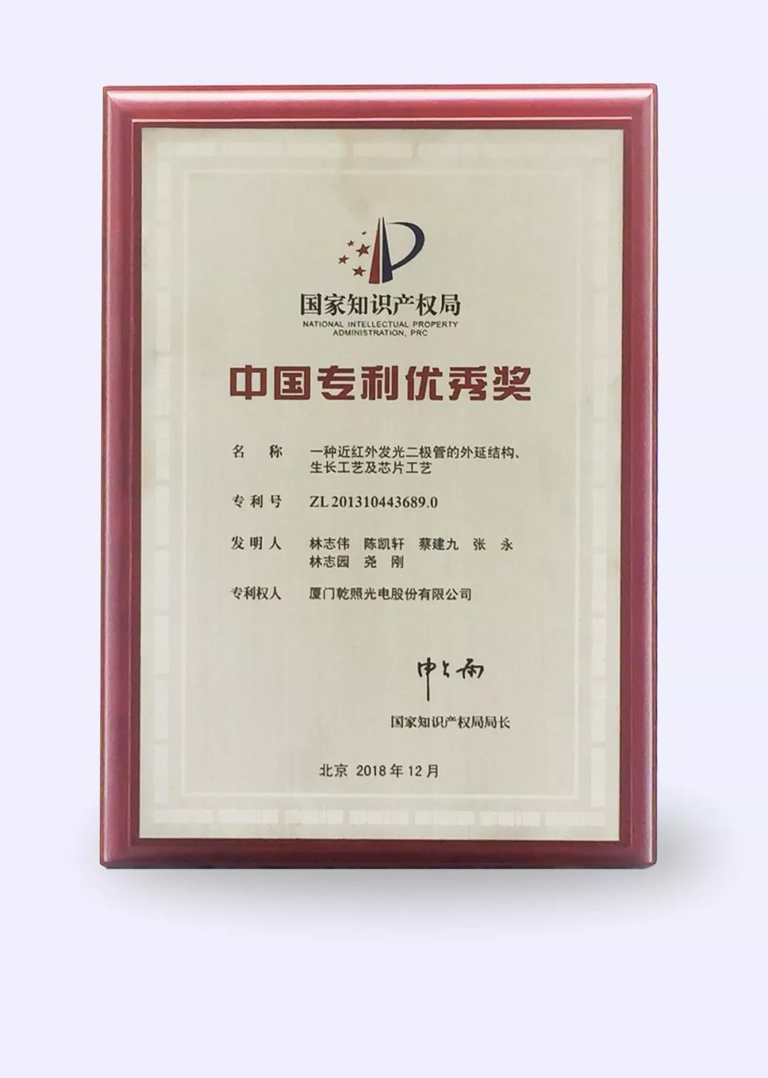 2018年歲末,國家知識產(chǎn)權(quán)局公布了第二十屆中國專利獎獲獎名單。其中,廈門乾照光電股份有限公司的發(fā)明專利《一種近紅外發(fā)光二極管的外延結(jié)構(gòu)、生長工藝及芯片工藝》(專利號:ZL201310443689.0)榮獲第二十屆中國專利優(yōu)秀獎。