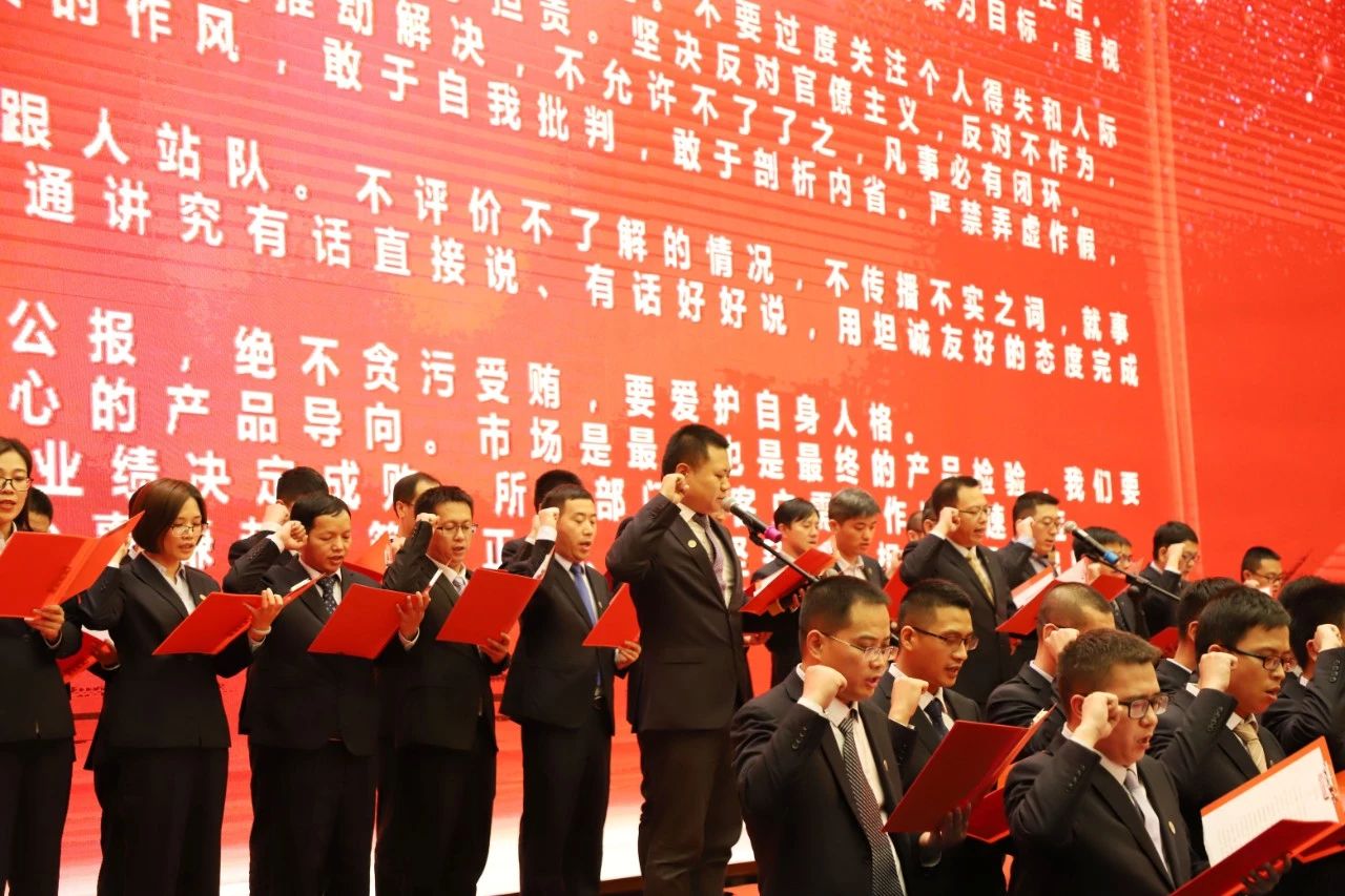 表彰結束,董事長金章育,總裁蔡海防帶領著公司經理層以上管理人員,面對全體員工莊嚴宣誓。隨后,金章育董事長進行致辭發(fā)言,他以“一心”、“砥礪”、“同袍”三個關鍵詞完美詮釋了本次尾牙的主題。他希望全體乾照人都能夠理解與踐行“同袍一心,砥礪前行”,鑄鐵軍,展鴻路。最后,股東代表三盛資本總裁王建輝先生作嘉賓致辭,他回憶了自身也曾經歷過的艱難時期,表示寒冬并不可怕,眾志成城,則為崛起之勢,看好乾照的未來。