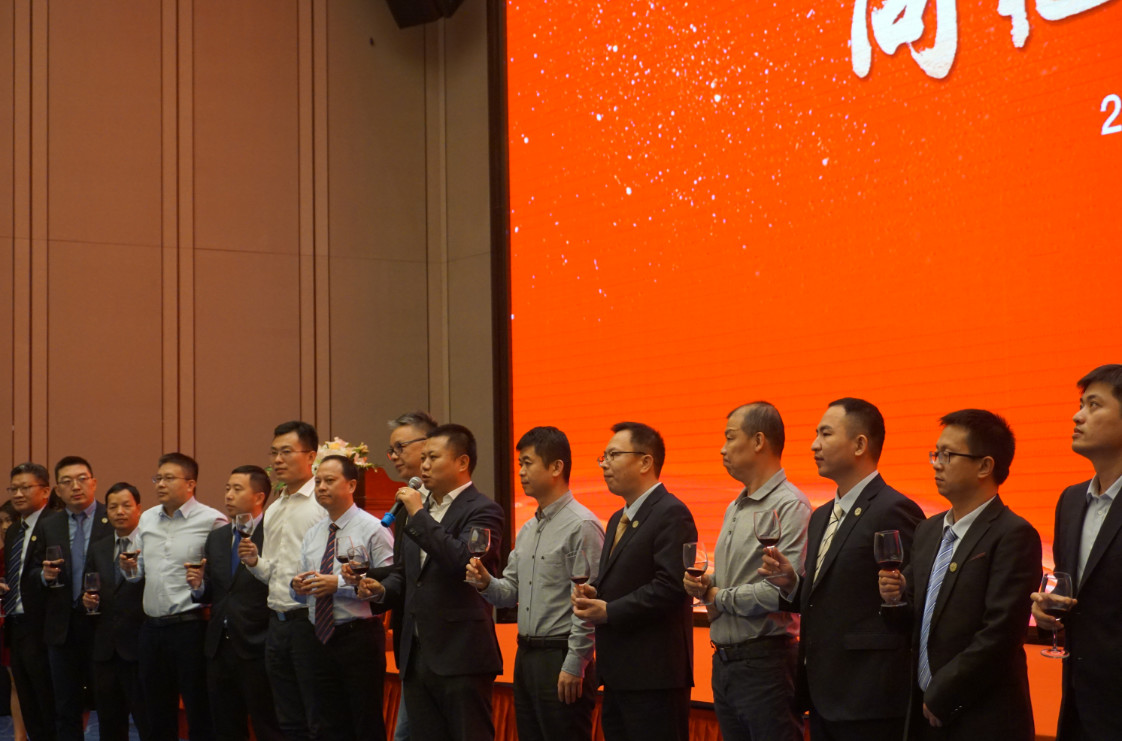 領導致辭后,晚宴正式開始。金章育董事長和嘉賓一起,攜公司高管上臺致祝酒詞。今夜,我們共同舉杯,敬過往,也敬未來!