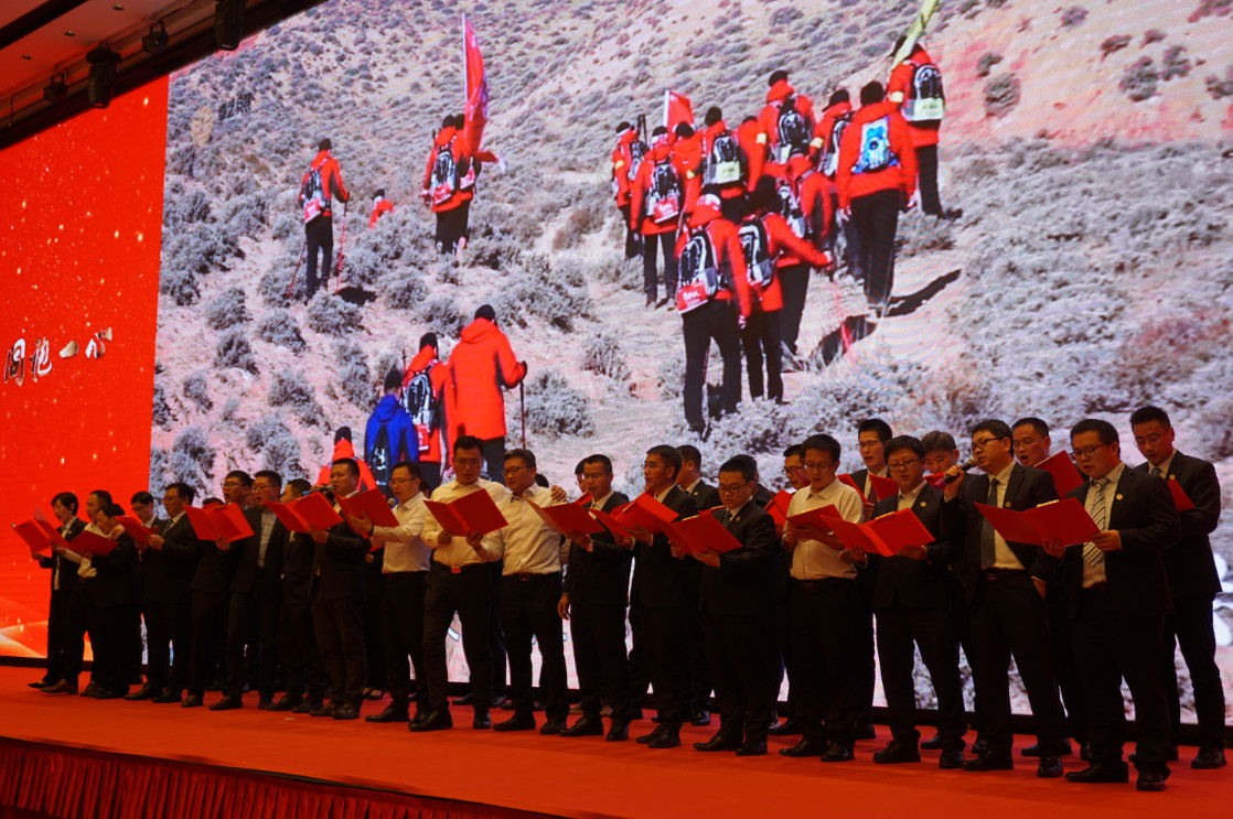 為增加晚宴歡慶氣氛,集團總部尾牙晚宴特別安排了慶生環(huán)節(jié),為全體12月生日員工共賀誕辰。董事長金章育作為壽星代表與壽星們一同切蛋糕做游戲。最后,參與張掖徒步的高管們共同上臺,合唱一曲《壯志在我胸》,將晚宴現場推向高潮。
