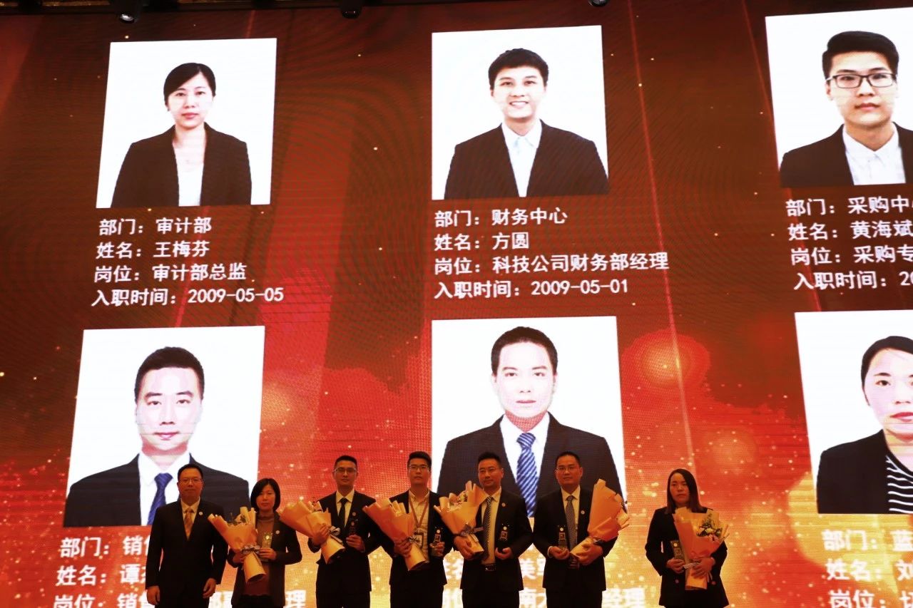 總結報告后,公司對2019年工作中表現突出的個人和團隊進行了表彰。此次表彰共設置了最佳新人獎、基層骨干獎,技術精英獎、管理卓越獎、優(yōu)秀部門獎、優(yōu)秀班組獎、科技進步獎、十年員工、黨支部優(yōu)秀黨員獎、“乾照十佳人物”等十大獎項,共計79人獲個人獎項,12個團隊獲團體獎項。按照往年慣例,“乾照十佳人物”的頒獎環(huán)節(jié)由董事長金章育親自主持并為獲獎人員一一頒獎,總裁蔡海防為十年員工頒發(fā)十年紀念金幣。