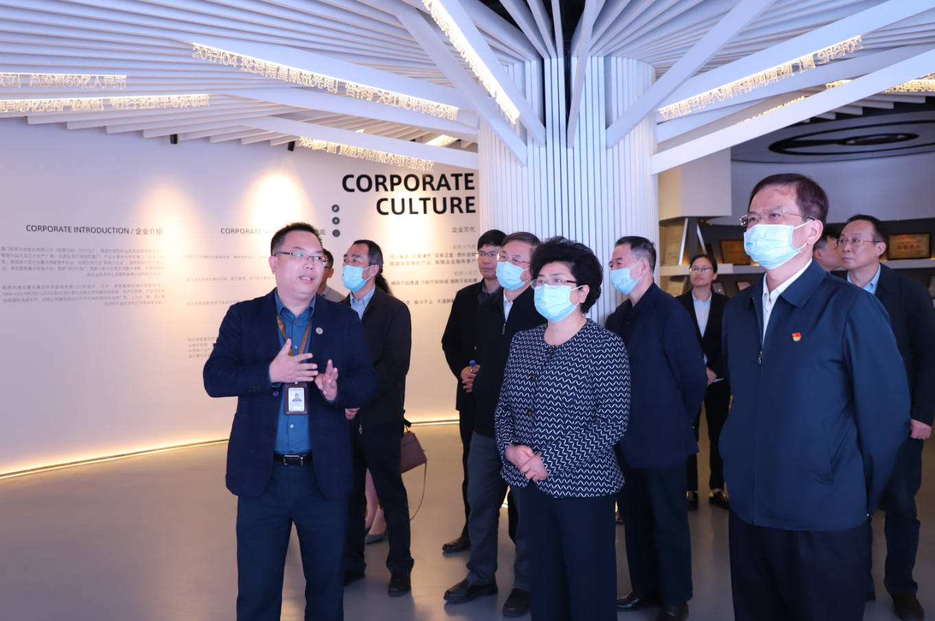 吳洪芹一行首先參觀了公司展廳,詳細了解了公司在高性能砷化鎵太陽電池外延片、Mini-LED/Micro-LED及化合物半導體相關(guān)領(lǐng)域的發(fā)展情況和發(fā)展規(guī)劃。期間,吳洪芹高度肯定了乾照光電當前階段取得的成績,并在企業(yè)發(fā)展方面提出了相關(guān)建議。吳洪芹指出,按照省委“再學習、再調(diào)研、再落實”要求,認真貫徹落實科技進步“一法一例”,大力實施創(chuàng)新驅(qū)動發(fā)展戰(zhàn)略,提高科技自立自強能力,不斷壯大高質(zhì)量發(fā)展超越新動能;要強化人才培養(yǎng)引進,激發(fā)人才創(chuàng)新創(chuàng)業(yè)創(chuàng)造活力;支持高校、科研院所、企業(yè)組建創(chuàng)新聯(lián)合體,推動協(xié)同創(chuàng)新。