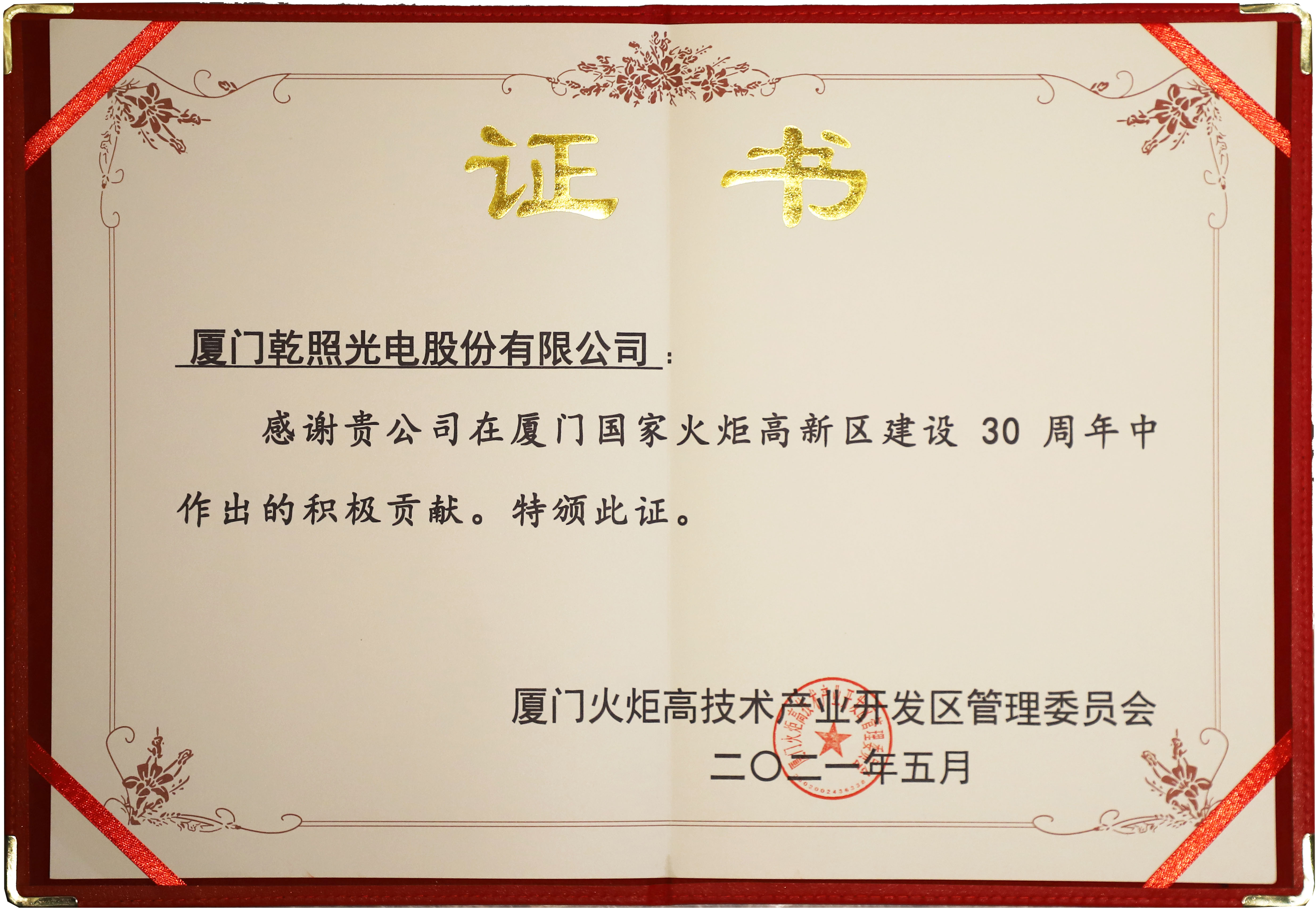 5月9日,廈門國(guó)家火炬高新區(qū)建設(shè)30周年暨高質(zhì)量發(fā)展再動(dòng)員大會(huì)在火炬廣場(chǎng)盛大舉行。福建省委常委、廈門市委書記趙龍,科技部原副部長(zhǎng)劉燕華、中國(guó)國(guó)家知識(shí)產(chǎn)權(quán)局原局長(zhǎng)田力普、科學(xué)技術(shù)部火炬高技術(shù)產(chǎn)業(yè)開發(fā)中心主任賈敬敦等國(guó)家部委及省市領(lǐng)導(dǎo)出席此次活動(dòng)。乾照光電榮獲“廈門國(guó)家火炬高新區(qū)建設(shè)30周年突出貢獻(xiàn)企業(yè)”稱號(hào)。
