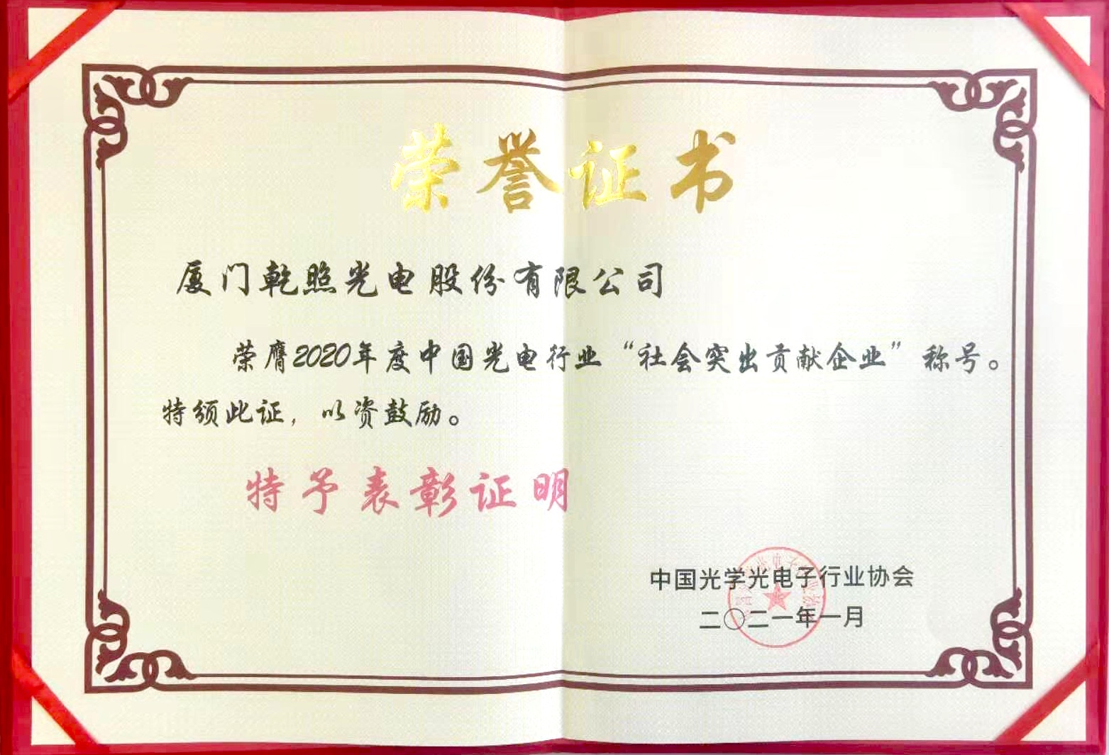 廈門乾照光電榮獲“2020年度中國光電行業(yè)‘社會突出貢獻企業(yè)’”稱號