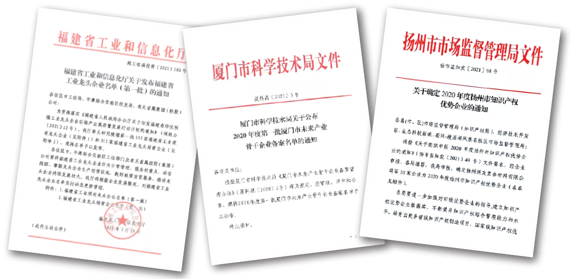 此外,廈門乾照光電入選“福建省工業(yè)龍頭企業(yè)”、“廈門市未來產(chǎn)業(yè)骨干企業(yè)”;揚州乾照光電入選“揚州市2020年知識產(chǎn)權優(yōu)勢企業(yè)”、“揚州市2020年工業(yè)百強企業(yè)”、“2020年發(fā)明專利十強企業(yè)”。