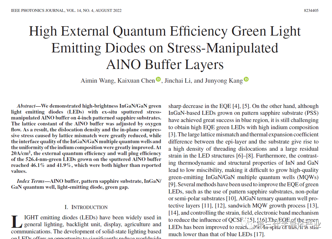 近日,廈門大學(xué)物理科學(xué)與技術(shù)學(xué)院與乾照光電協(xié)同攻關(guān),在提升綠光LED效率方面取得重大進(jìn)展。該研究成果以“High External Quantum Efficiency Green Light Emitting Diodes on Stress-Manipulated AlNO Buffer Layers”為題發(fā)表于IEEE PHOTonICS JOURNAL 14(4) (2022) 8234405。