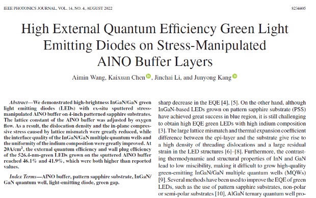 8月份,廈門大學(xué)物理科學(xué)與技術(shù)學(xué)院與乾照光電協(xié)同攻關(guān),在提升綠光LED效率方面取得重大進(jìn)展。該研究成果以“High External Quantum Efficiency Green Light Emitting Diodes onStress-Manipulated AlNO Buffer Layers”為題發(fā)表于IEEE PHOTonICSJOURNAL 14(4) (2022) 8234405。廈門大學(xué)康俊勇教授與乾照光電陳凱軒博士團(tuán)隊(duì)經(jīng)過3年的聯(lián)合攻關(guān),提出通過并入高濃度氧形成AlNO緩沖層的方法,降低圖形化藍(lán)寶石襯底與GaN外延層間晶格失配導(dǎo)致的應(yīng)力與缺陷,進(jìn)而減緩了MQW中阱/壘的應(yīng)力及其壓電極化效應(yīng),提升了阱/壘界面的陡峭度,提高了阱中In組分的一致性,最終提高了LED的光電轉(zhuǎn)換效率。