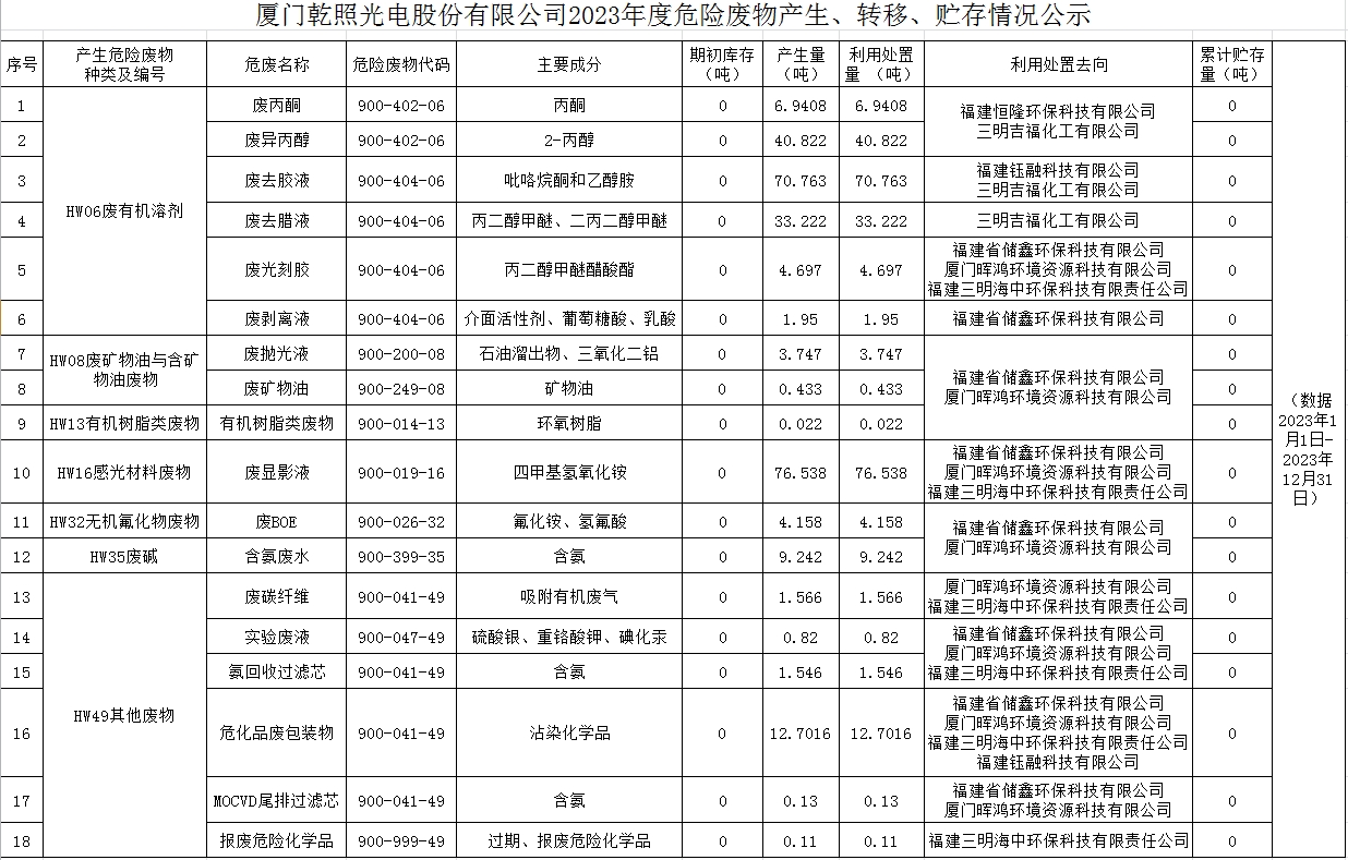 廈門乾照光電股份有限公司2023年度危險(xiǎn)廢物產(chǎn)生、轉(zhuǎn)移、貯存情況公示