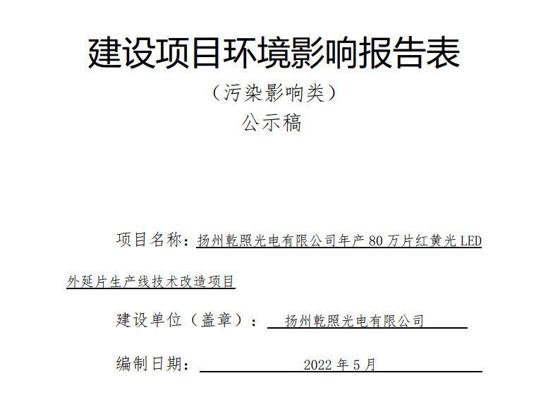 揚(yáng)州乾照光電有限公司年產(chǎn)80萬片紅黃光LED外延片生產(chǎn)線技術(shù)改造項(xiàng)目環(huán)境影響報(bào)告表公示稿