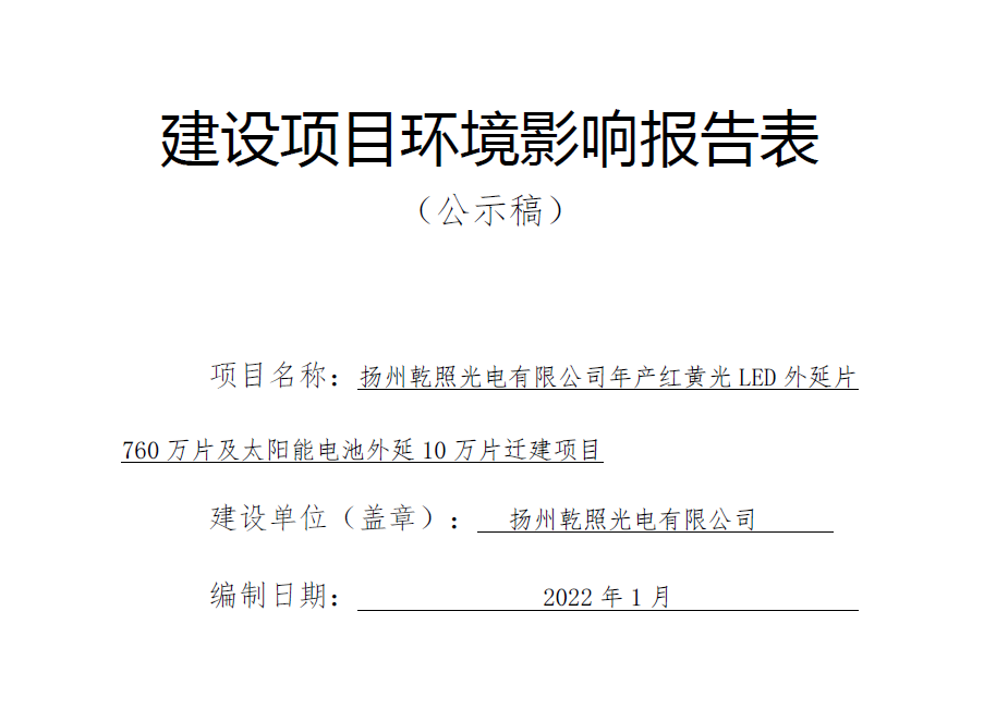 《揚(yáng)州乾照光電有限公司年產(chǎn)紅黃光LED外延片760萬片及太陽能電池外延10萬片遷建項目環(huán)境影響報告表公示稿》 /uploadfiles/2022/04/20220402144205425.pdf 《揚(yáng)州乾照光電有限公司年產(chǎn)紅黃光LED外延片760萬片及太陽能電...