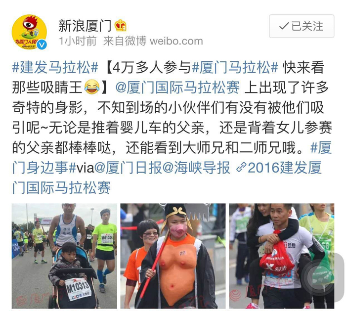 當然,這也離不開所有參賽選手們的齊心協(xié)助與辛苦付出。在賽道上,他們獨樹一幟,彰顯個性。在蕓蕓人海中,賺足了大眾的眼球。二師兄還上了當日新浪廈門官方微博頭條呢。師徒仨及我司的吉祥物也被廈門網(wǎng)、廈門晚報等媒體報道啦。這不僅僅展示了參賽者的活力,更彰顯了我司的品牌魅力。