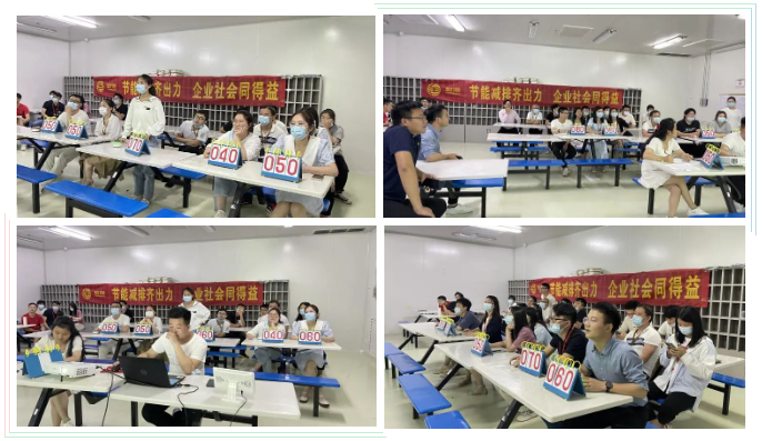 隨后,在公司培訓(xùn)室又進行了一場關(guān)于能源管理的培訓(xùn)并同步開展知識答題競賽活動?,F(xiàn)場共吸引30名員工參與,經(jīng)過工作人員系統(tǒng)講解能源和環(huán)保管理等方面的相關(guān)知識后,緊張而又激烈的知識競賽就開始了!競賽中,五人一組,隨機搶答,選手們?nèi)褙炞?、認真思索,以昂揚的斗志、飽滿的熱情投入到比賽中?,F(xiàn)場氣氛活躍,最后經(jīng)過激烈PK,六名選手獲得了本次比賽大獎!